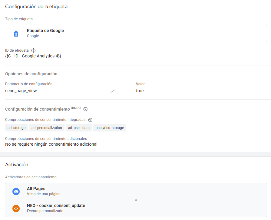 Esta etiqueta configura el seguimiento básico para enviar datos desde la web a tu cuenta de GA4. A partir de aquí, podrás crear otras etiquetas de GA4 para la medición de eventos usando activadores específicos y variables.