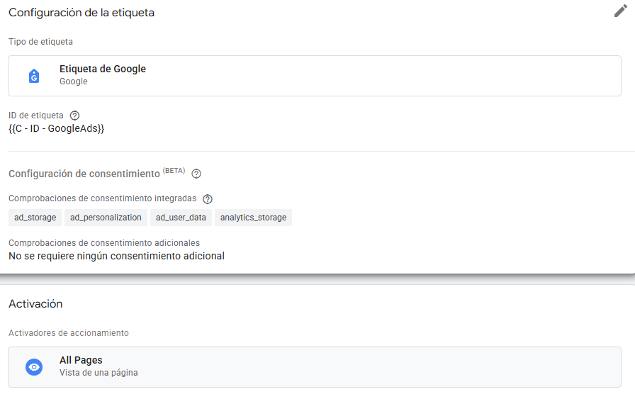 Al igual que ocurre con GA4, antes de configurar etiquetas de medición de eventos con Google Ads, también hay que configurar la etiqueta de Google de Ads para enviar datos de la web a la plataforma de Google Ads.