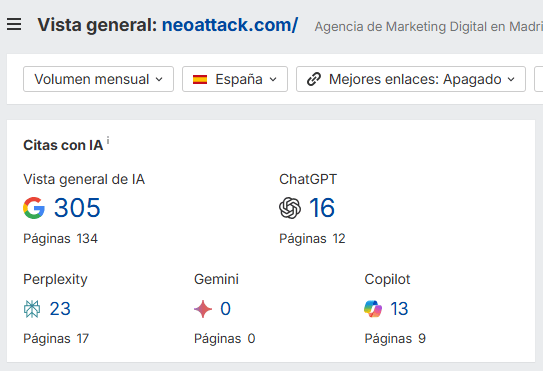 Lejos de desplazar al SEO, las IA nos empujan a mejorar la calidad y autenticidad de lo que ofrecemos. Una consultoría SEO actual también te mostrará datos del número de apariciones y menciones tanto en las AI Overviews de Google como en ChatGPT, Gemini o Perplexity.